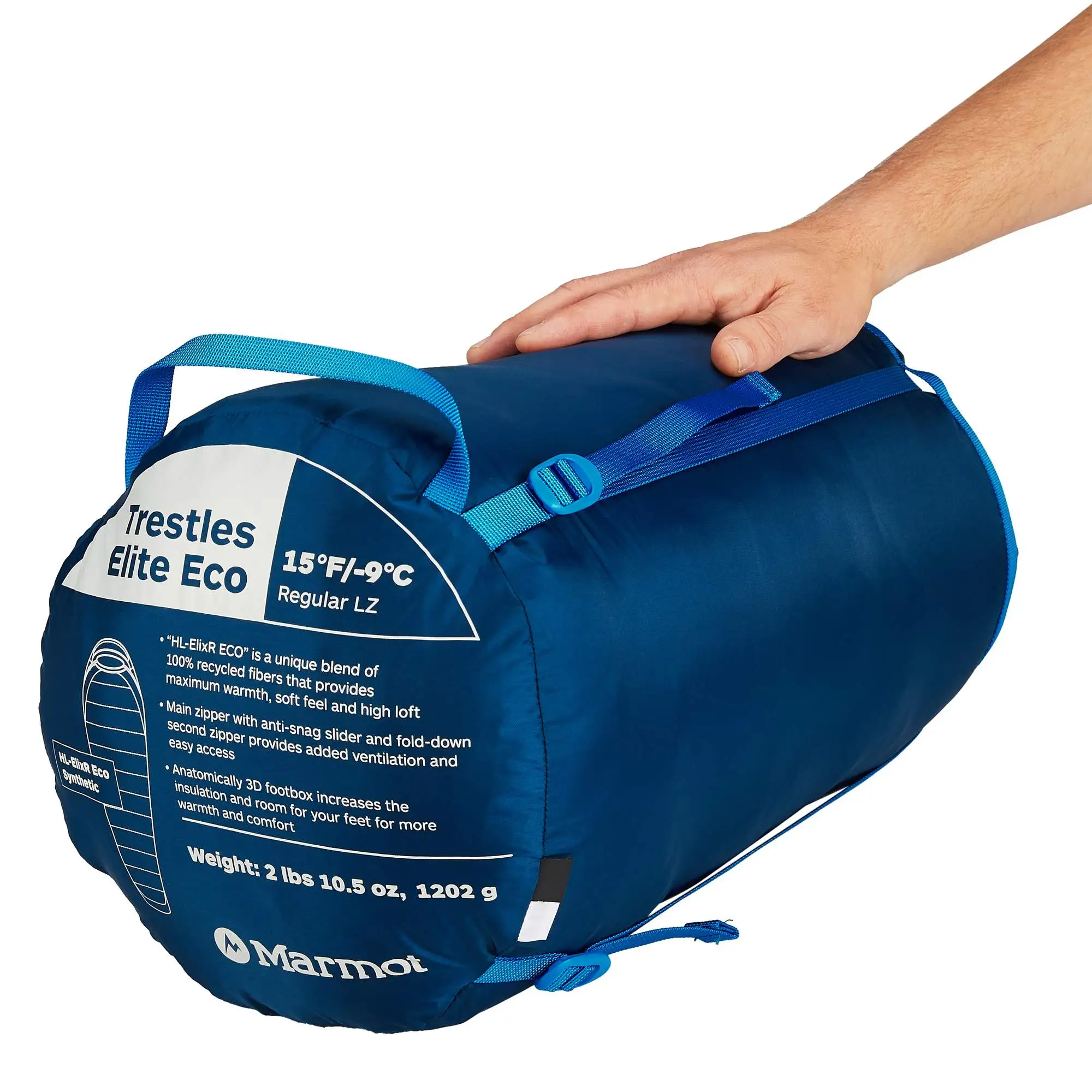 Der Einsatz von Kunstfasermaterialien macht den Trestles Elite Eco 15 unempfindlich gegen Nässe. Er besteht zu 100% aus recycelten Materialien und kann bis -3°C eingesetzt werden.